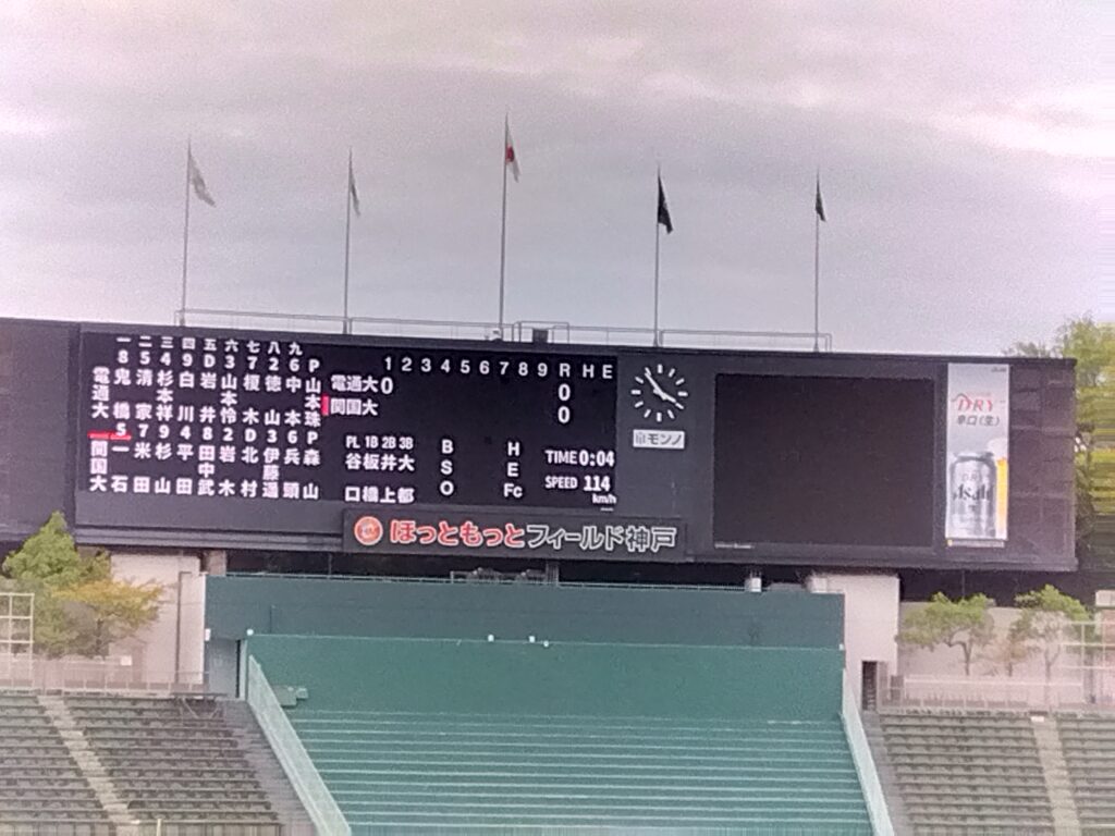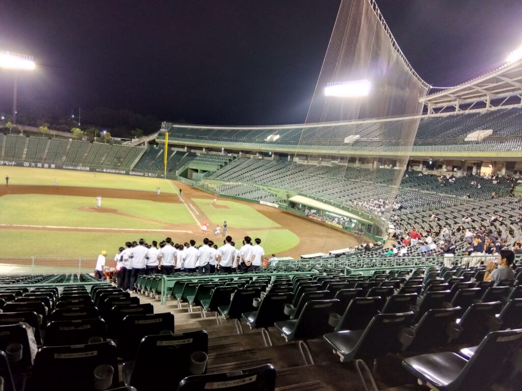 当日は、ほっともっとフィールド神戸(旧グリーンスタジアム神戸)で開催されており、以前から球場で時々お会いする野球好きの母校職員Iさんと戦況に一喜一憂しながら応援をしました。悔しい敗戦となりましたが各選手のはつらつとした動きや白川外野手のホームランも見ることが出来たので、満足の一日でした。スタンドでの野球部員の応援も楽しかったです。