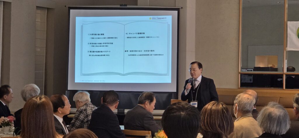 大石理事長による母校の近況レポートでは、少子化状況下での競争と奮闘の中で常に大学の評価を“A”ランクに維持する厳しさに感銘しました。