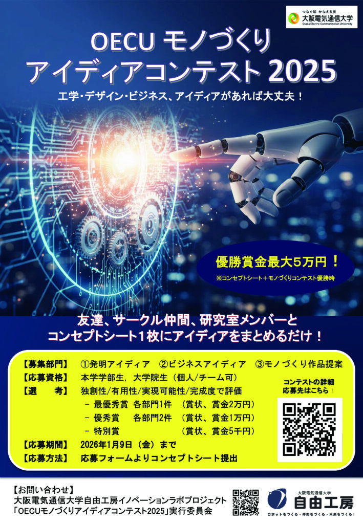 大阪電気通信大学発モノづくりプロジェクト「自由工房」の新しい取り組みとして開催された「OECUモノづくりアイディアコンテスト2025」の最終審査会場に、この度お伺いしました。